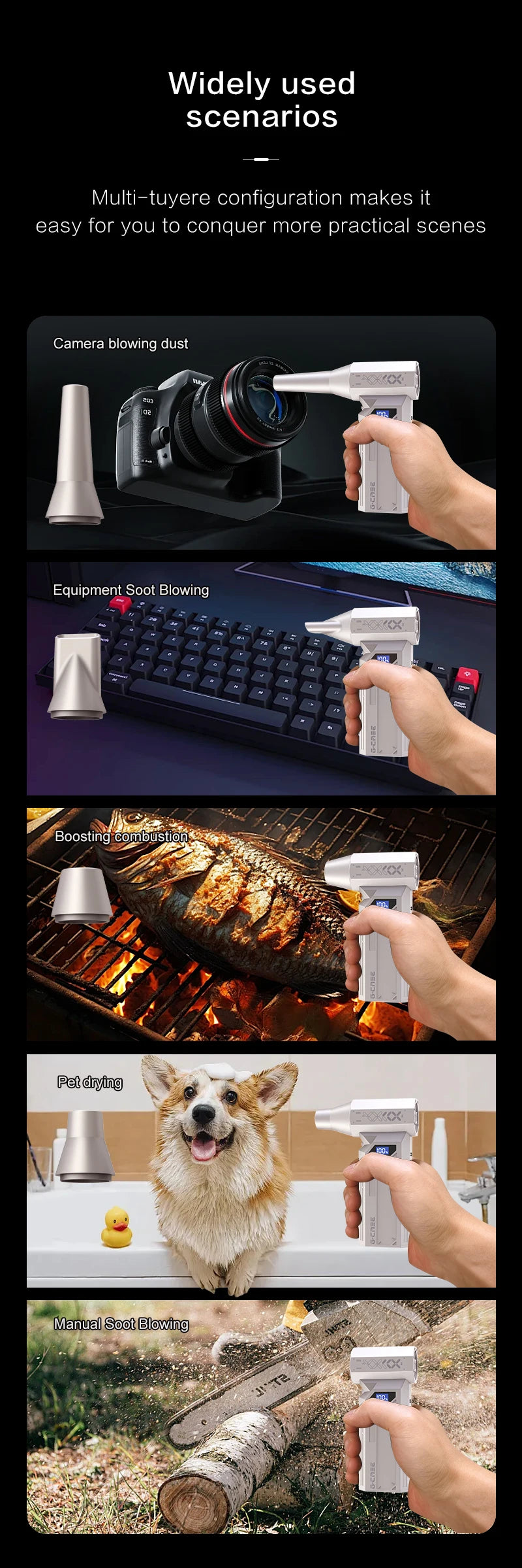 - Maison et extérieur : soufflage de feuilles, séchage rapide ou allumage de charbon.