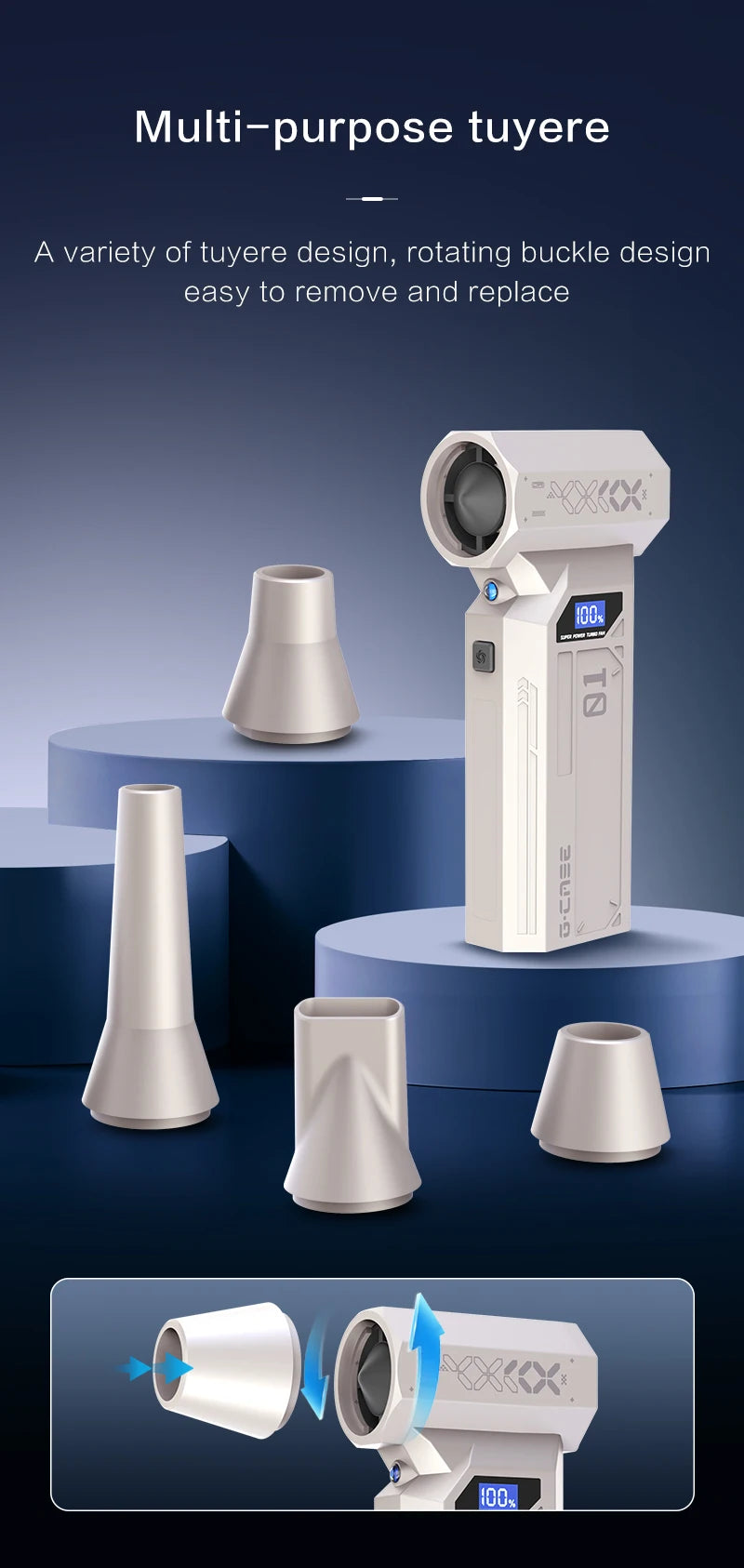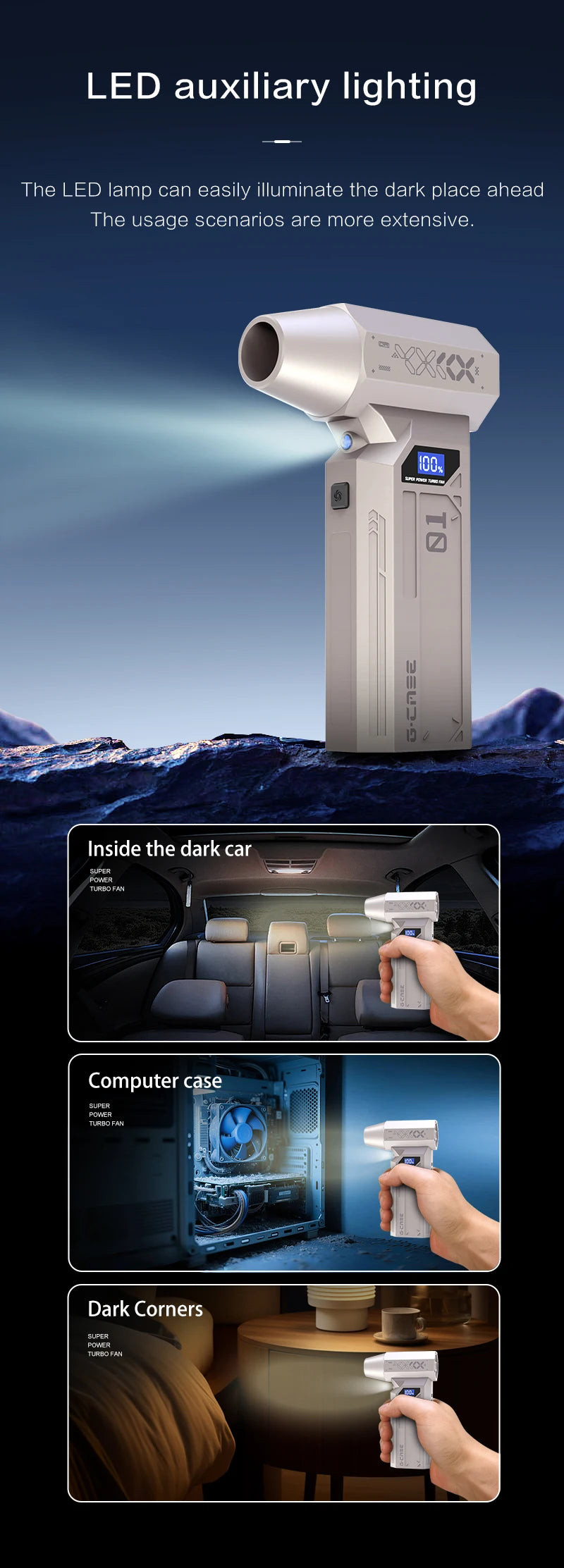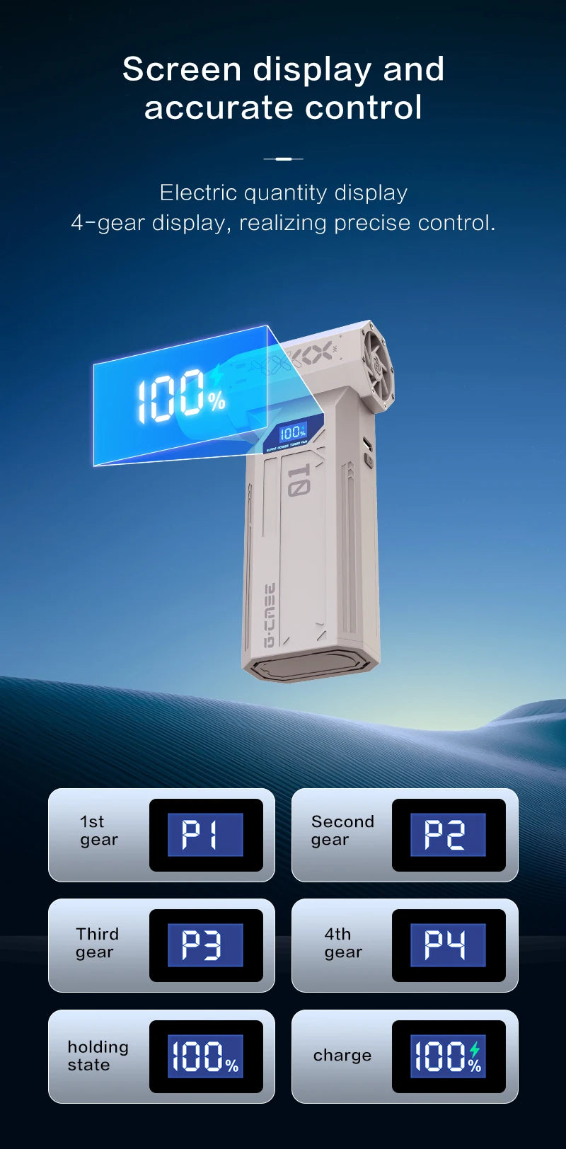 Le souffleur 990000RPM dispose d’un réglage de vitesse à 4 niveaux, dont un mode “Violent” activable par pression longue pour libérer toute la puissance du moteur. Facile à manier, il est doté d’une poignée ergonomique et d’un corps robuste en ABS, assurant à la fois confort, solidité et légèreté.