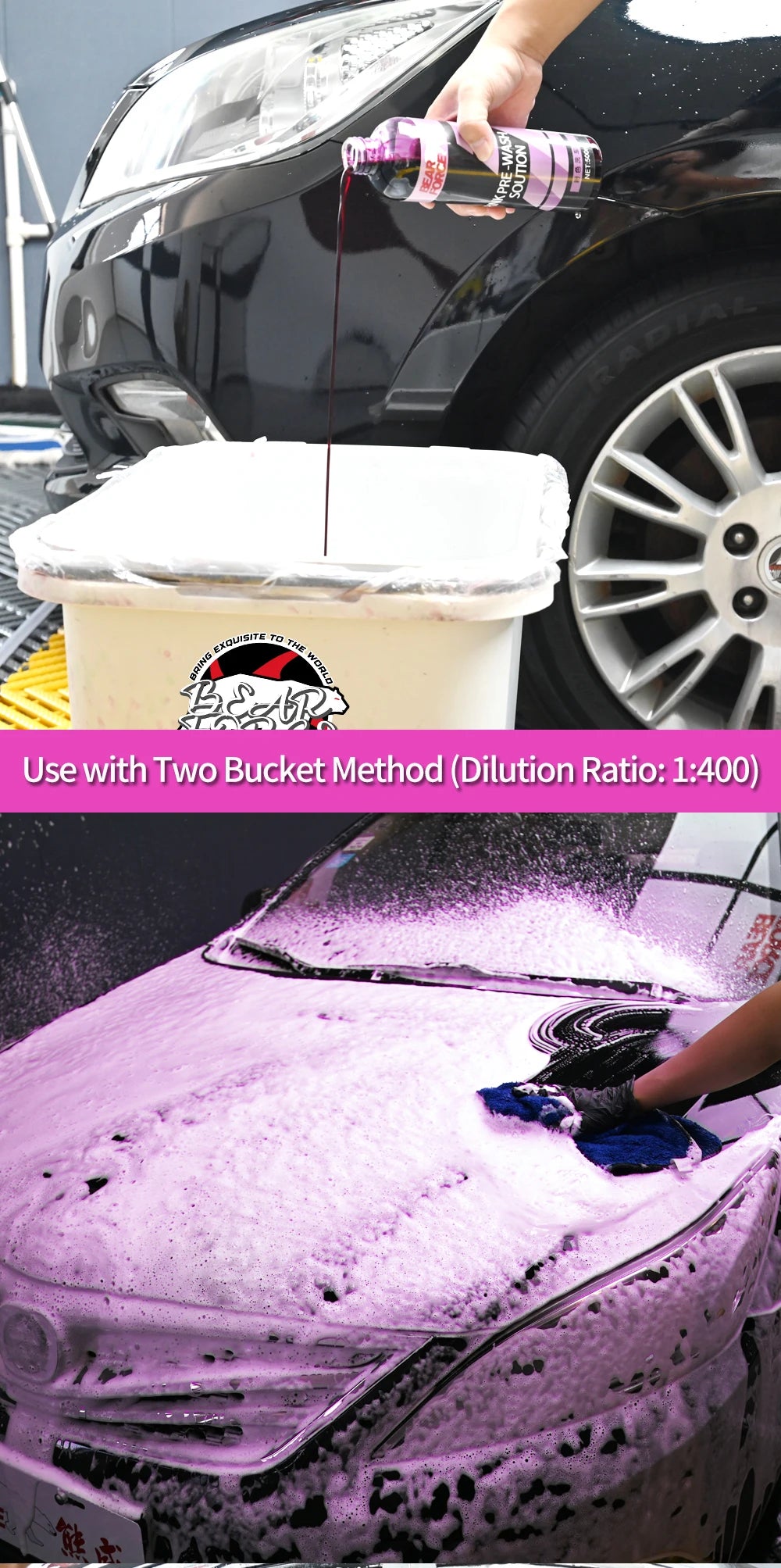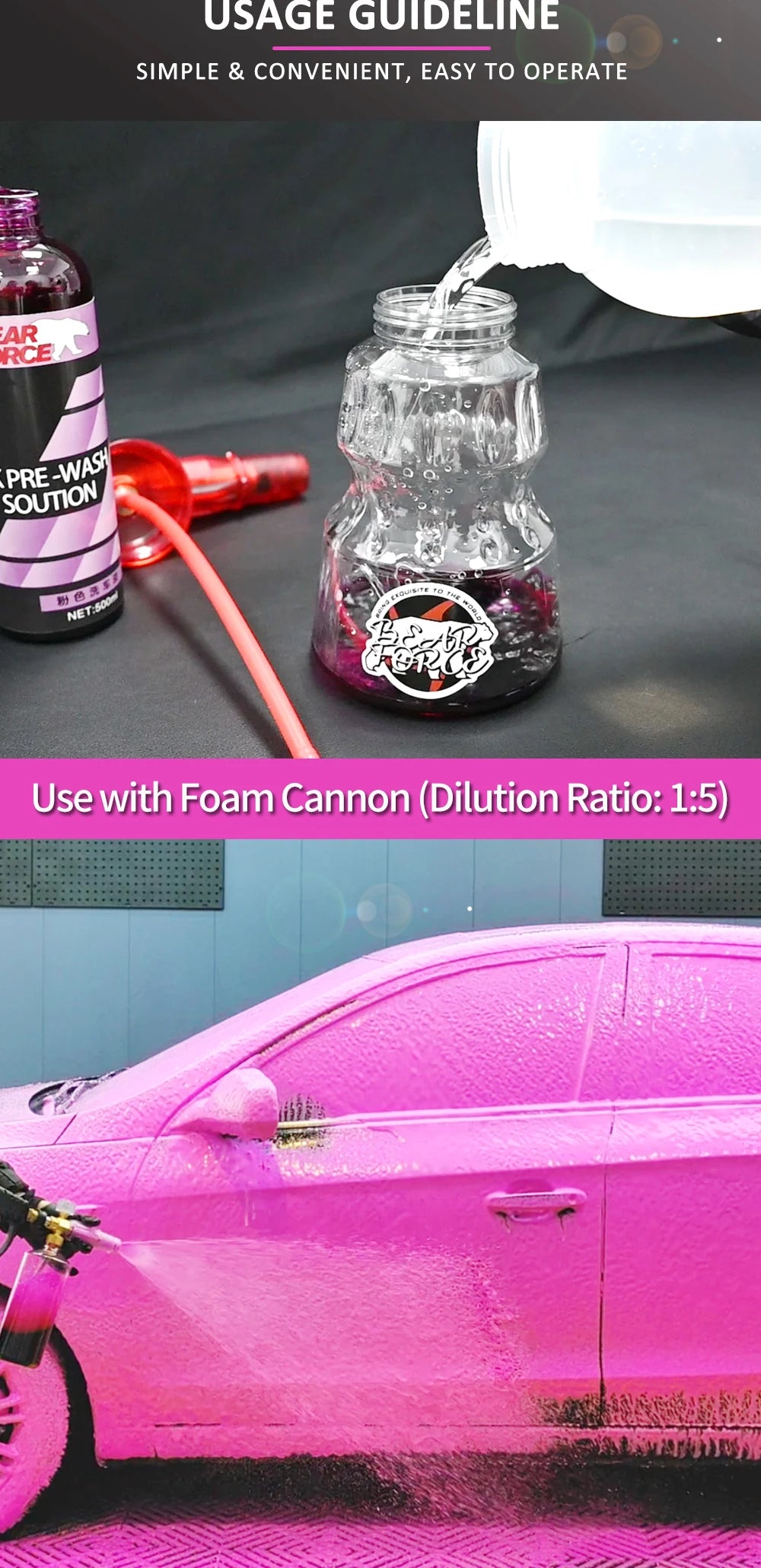 1. Dilute with clean water. Use With Foam Cannon - Dilution Ratio: 1:5), Use With Hand Pump Foam Sprayer - Dilution Ratio: 1:50, Use With Two Bucket Method (Dilution Ratio: 1:400).