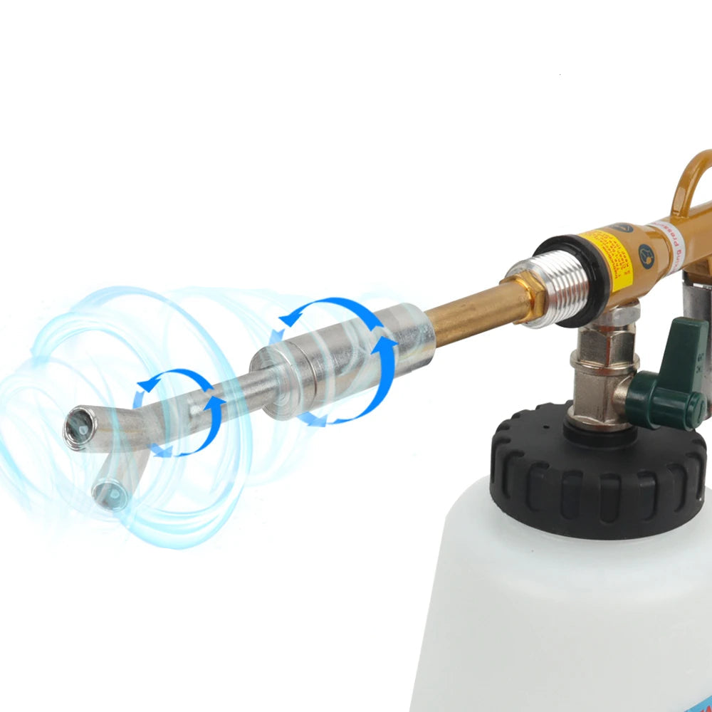 Branché à un compresseur d’air, le Tornador Bear Force génère un jet en spirale ultra-puissant qui propulse un mélange d’air et de solution nettoyante sous forme de fine brume.